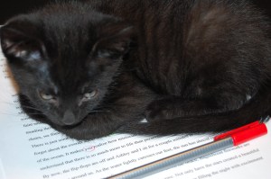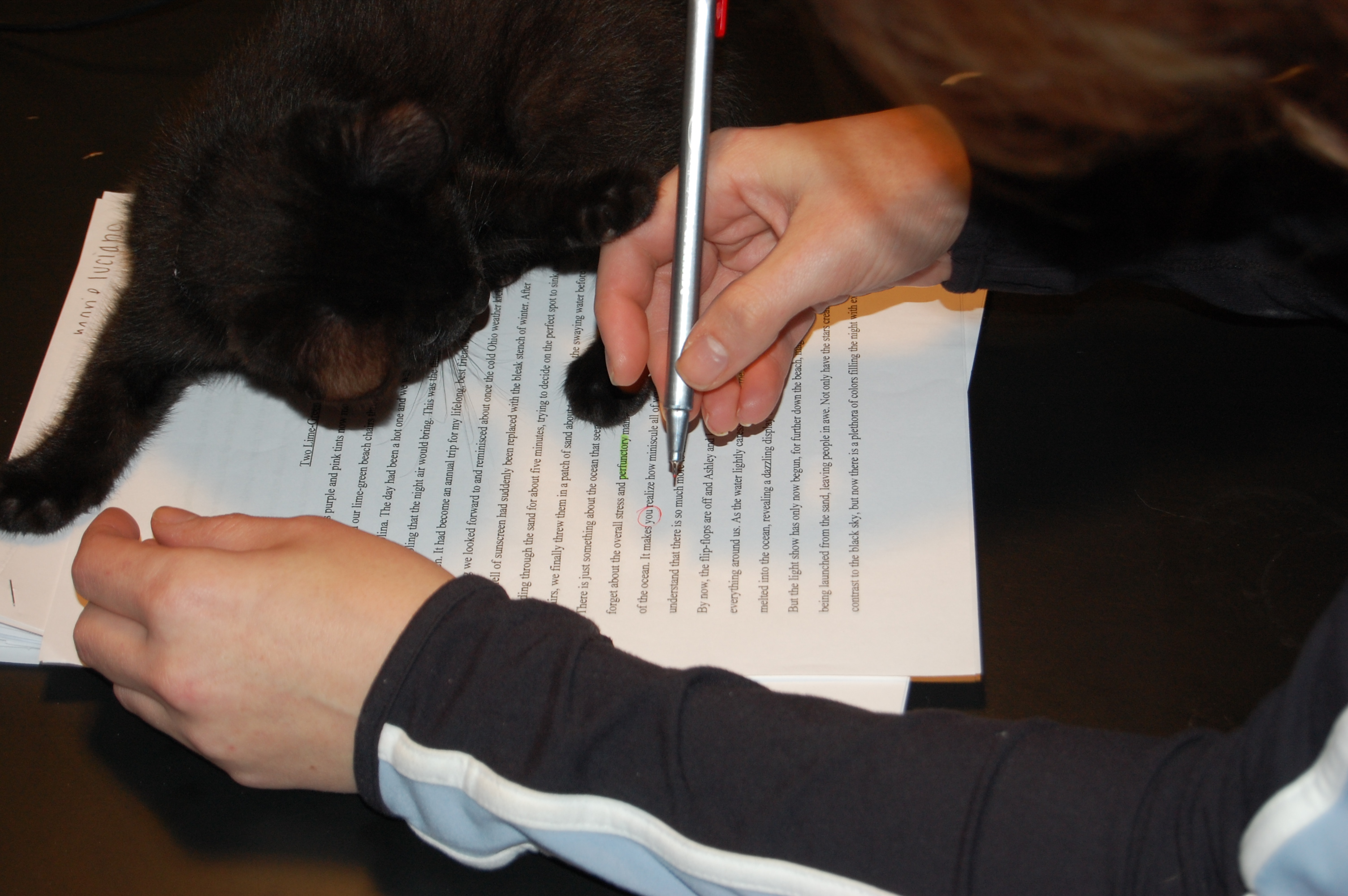 Please forgive me if I have been grading your essays, tests, and quizzes more slowly than usual. I promise I have been setting aside the same amount of time I normally do, but somehow I haven’t been getting as much done in that time. I think it may have something to do with the assistant who has recently started “helping” me.